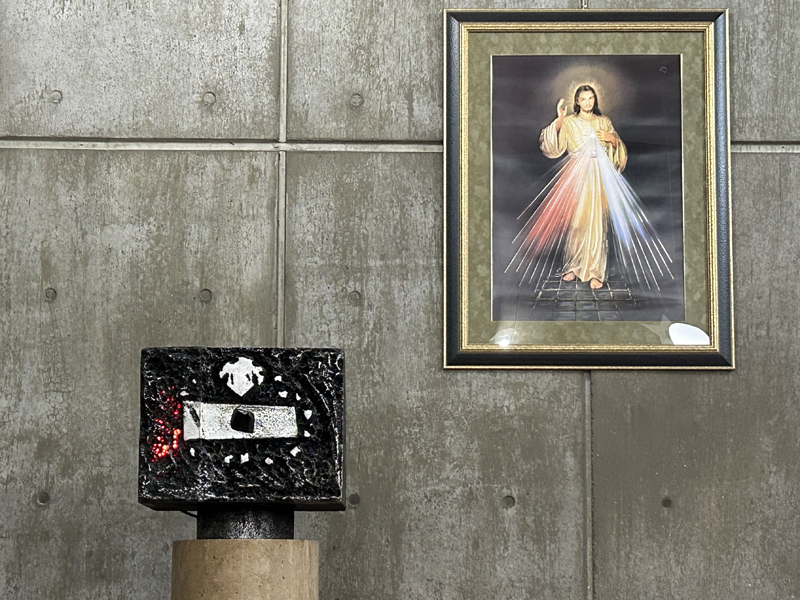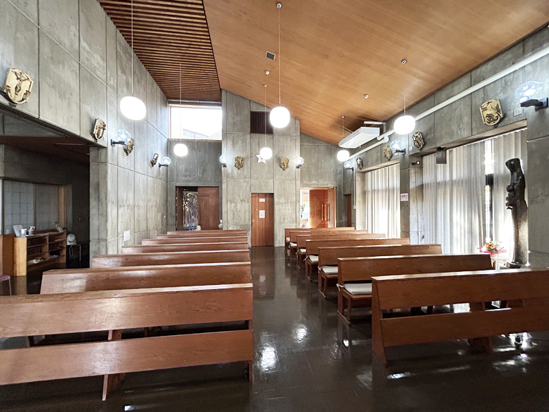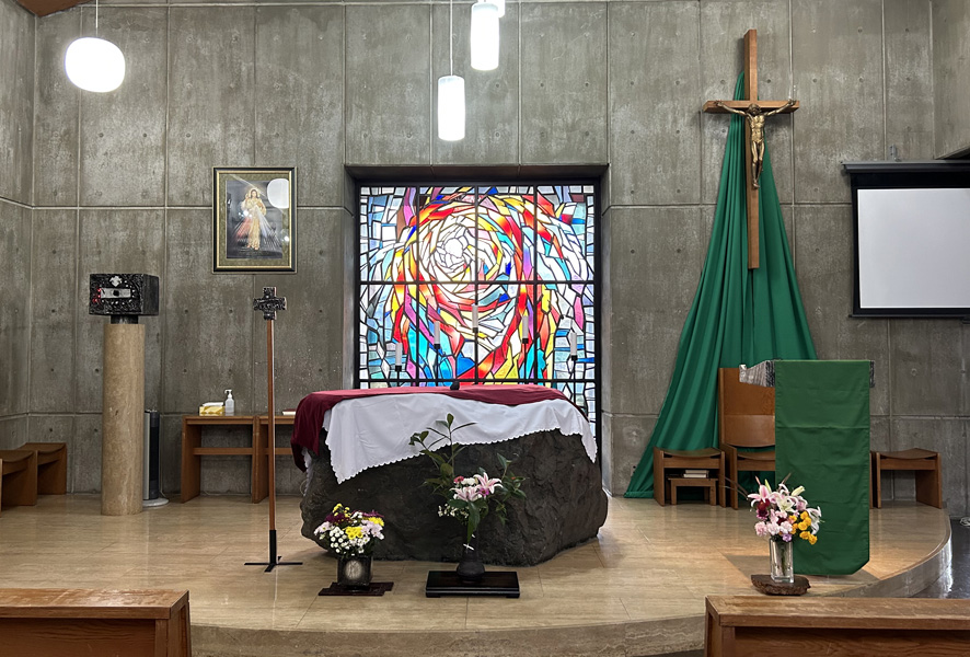 祭壇は揖斐川(いびがわ)産の自然石、祭壇の下には1667(寛文7)年尾張藩内高木で殉教したキリシタンの遺骨が納められました。祭壇の後ろにはライストナー女史作の「嵐の中の静けさ」を表すステンドグラスが設置され、聖堂前のロビーには教会の保護の聖人である日本26聖人殉教者の壁画レリーフが取り付けられました。