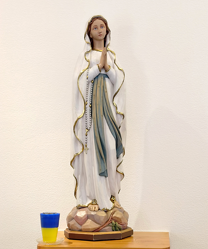 新しい聖堂は正面にある教会名でもある聖霊のステンドグラスが、聖堂内に絶えず降りそそいでいます。
