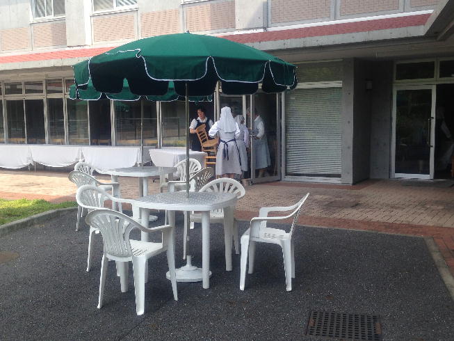 | 庭にイスを並べるシスターたち | 食堂のテーブルに花を準備するシスター |