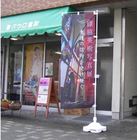 初日の22日(日)は、布池教会のミサの後、写真展の紹介をしてくださったので、初日は雨にもかかわらず、大勢の方が見に来てくださいました。その他、書院の前に立てたのぼり旗を見てきてくださった通りがかりの人、Facebookを見てきましたという女性、また四日市教会からは、長崎の髙見大司教の妹さんがおいでになり、三重から書院に買い物に来たら、写真展をしているということで、とても喜んでいらっしゃいました。
