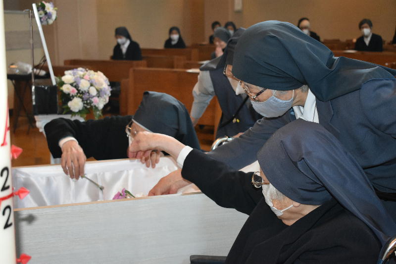 2月4日、38度の熱を出し、湘南東部総合病院に入院しました。肺炎と診断されましたが、少しずつ回復し、4月には退院して施設に戻る予定でおりました。しかし、再度高熱が出たため退院はかなわず、4月26日、肺炎のために再度高熱が出て、今後どのような治療を行っていったらいいかを病院と話し合っていましたが、急に悪化し、その日の夜、平塚の姉妹たちが夕食を取っていると、病院から「呼吸が止まった」と連絡が入り、急遽、Sr.堀井のもとに向かいました。死亡時刻は20時1分、死因は間質性肺炎でした。先生もあまりの急なことに、驚かれていたそうです。