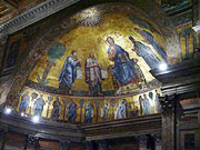 13世紀にヴェネツィアの芸術家によって描かれた祭壇の後方のモザイク画は、左から、ルカ、パウロ、栄光の座につかれた救い主キリスト、ペトロ、アンデレです。キリストの右足元には、このモザイク画を描かせた教皇ホノリウス3世が描かれ、その下には、福音史家と使徒たちが描かれています。
