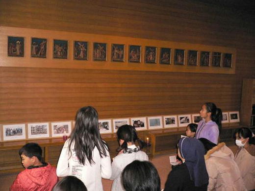 ① 聖堂の十字架の道行の下に、震災の十字架の道行きの写真を掲示する。