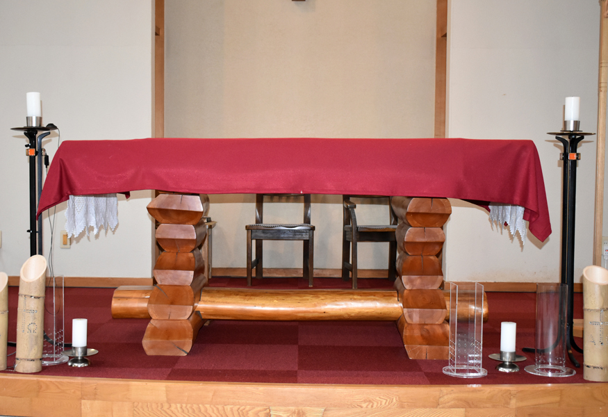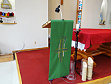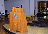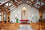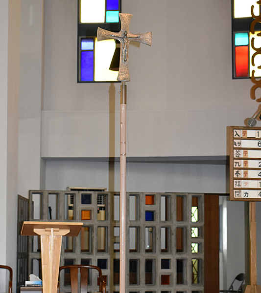 祭壇は揖斐川(いびがわ)産の自然石、祭壇の下には1667(寛文7)年尾張藩内高木で殉教したキリシタンの遺骨が納められました。祭壇の後ろにはライストナー女史作の「嵐の中の静けさ」を表すステンドグラスが設置され、聖堂前のロビーには教会の保護の聖人である日本26聖人殉教者の壁画レリーフが取り付けられました。