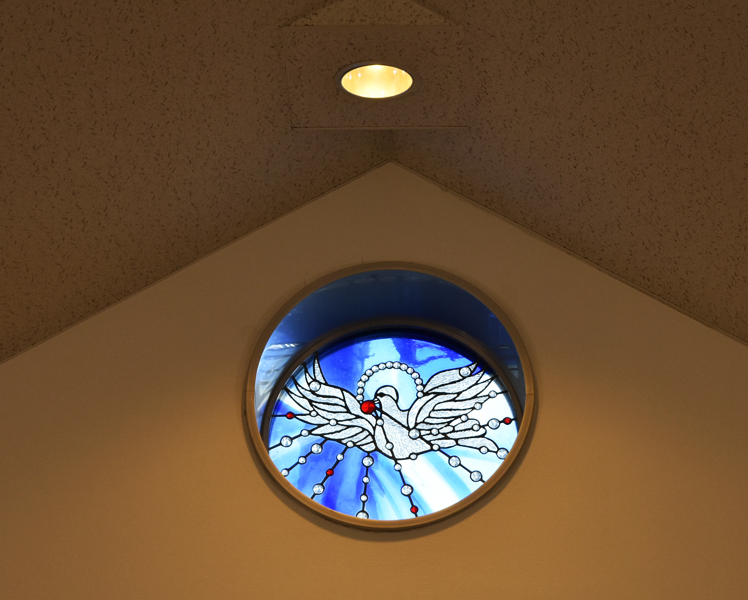 新しい聖堂は正面にある教会名でもある聖霊のステンドグラスが、聖堂内に絶えず降りそそいでいます。