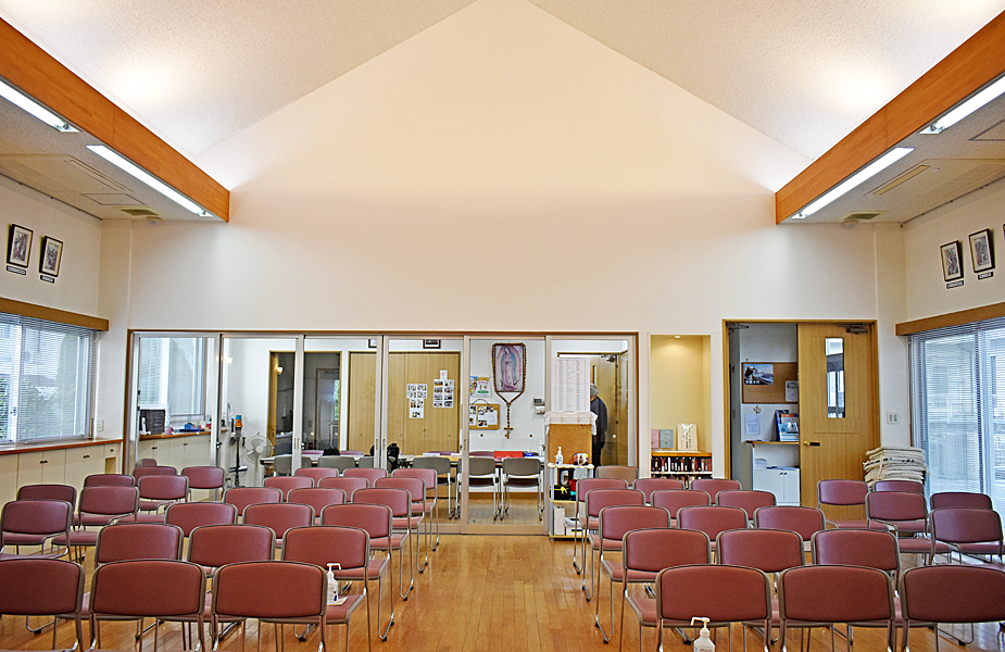 八木山教会は、外国宣教会により、仙台市郊外にできたばかりの八木山団地内に、開設されることが決まりました。それに先駆け1969(昭和44)年4月に「八木山カトリック幼稚園」が開園しました。当初幼稚園の園舎は、司祭の住居も兼ね、ホールで日曜日にミサが行われていました。