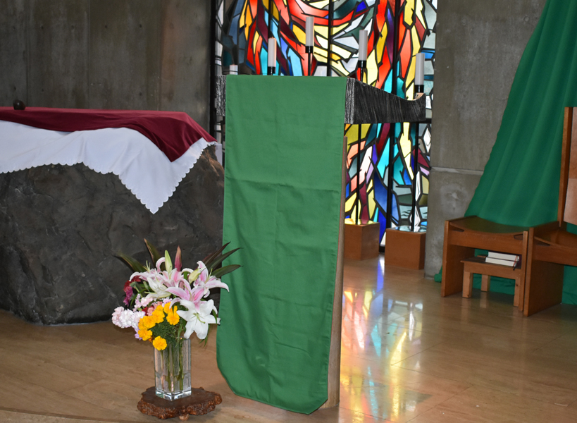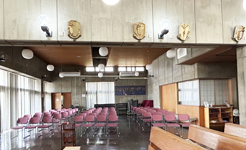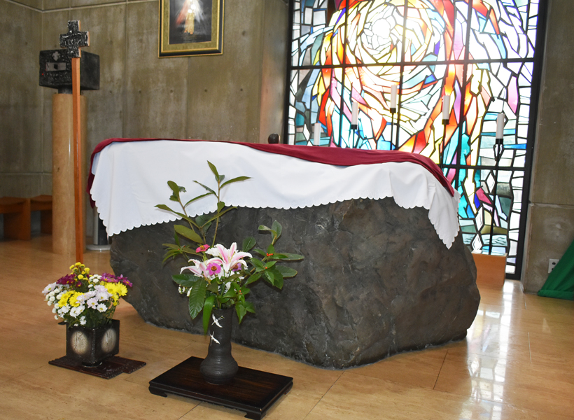 祭壇は揖斐川(いびがわ)産の自然石、祭壇の下には1667(寛文7)年尾張藩内高木で殉教したキリシタンの遺骨が納められました。祭壇の後ろにはライストナー女史作の「嵐の中の静けさ」を表すステンドグラスが設置され、聖堂前のロビーには教会の保護の聖人である日本26聖人殉教者の壁画レリーフが取り付けられました。